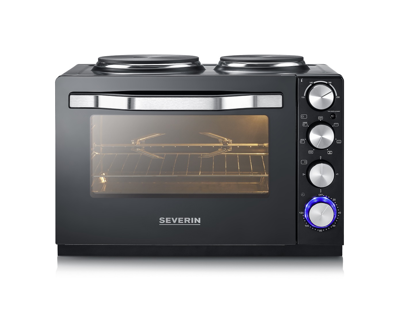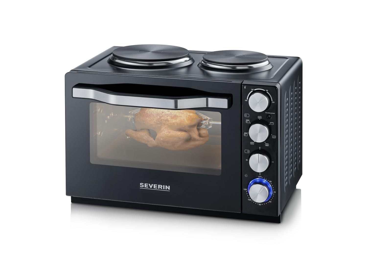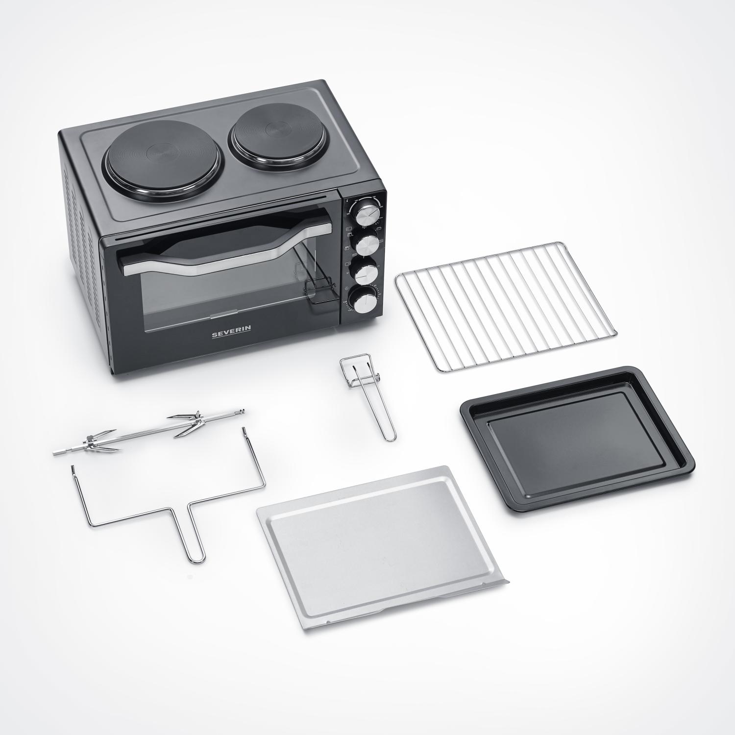 Kraftfull och mångsidig bänkspis på 30 liter med två kokplattor, varmluftsfunktion och roterande grillspett – en komplett matlagningsstation i kompakt format.