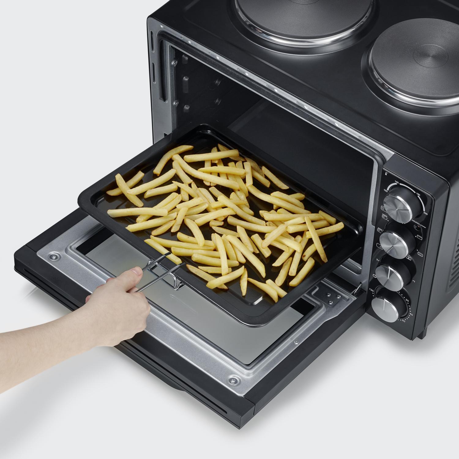 Dubbla kokplattor: Utrustad med två individuellt styrda kokplattor (1000W och 1500W) som gör att du kan koka potatis och steka samtidigt som ugnen är igång.