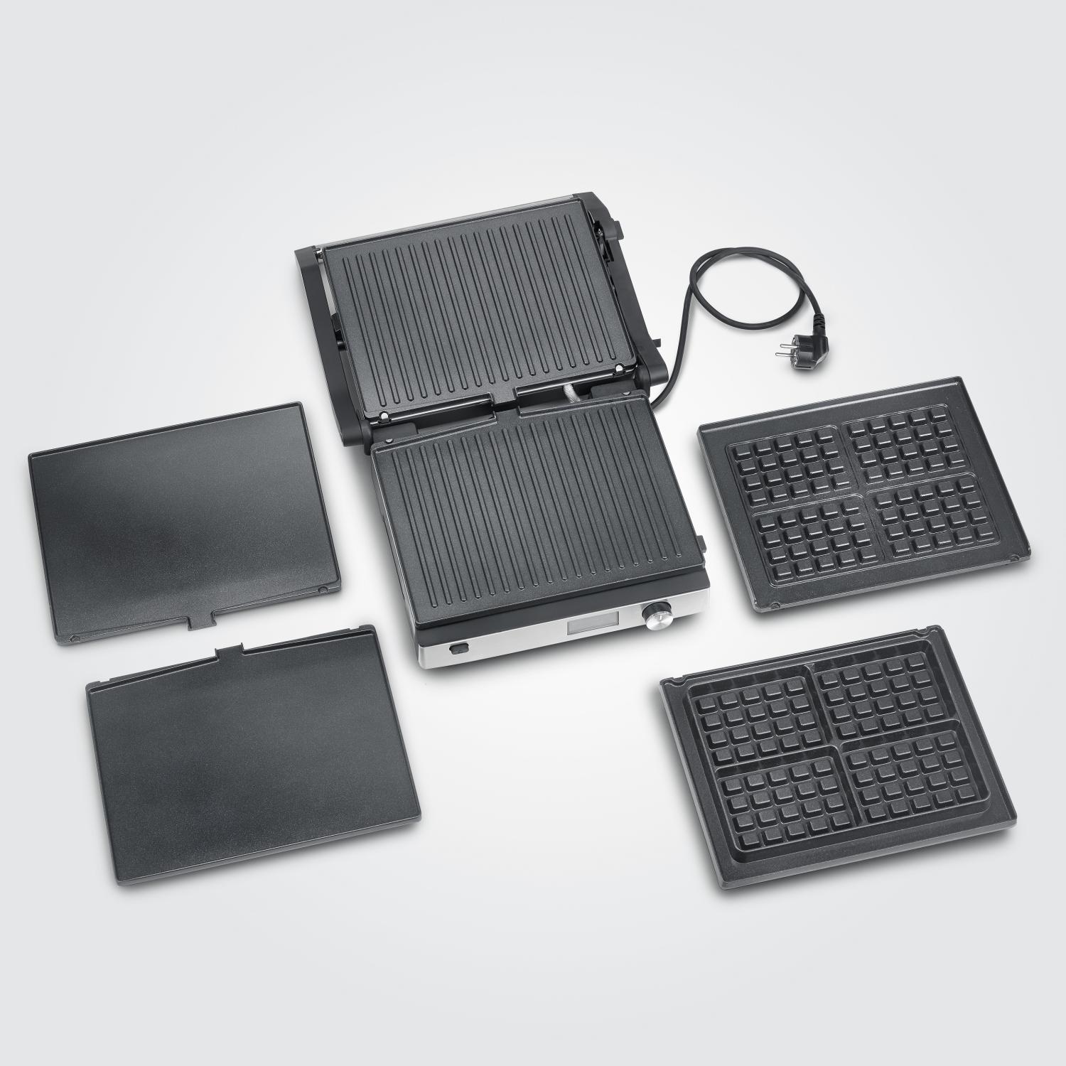 Ultimat 3-i-1-multigrill på 2000W med utbytbara plattor för grillning, smörgåsar och belgiska våfflor – utrustad med digital display och keramisk beläggning.