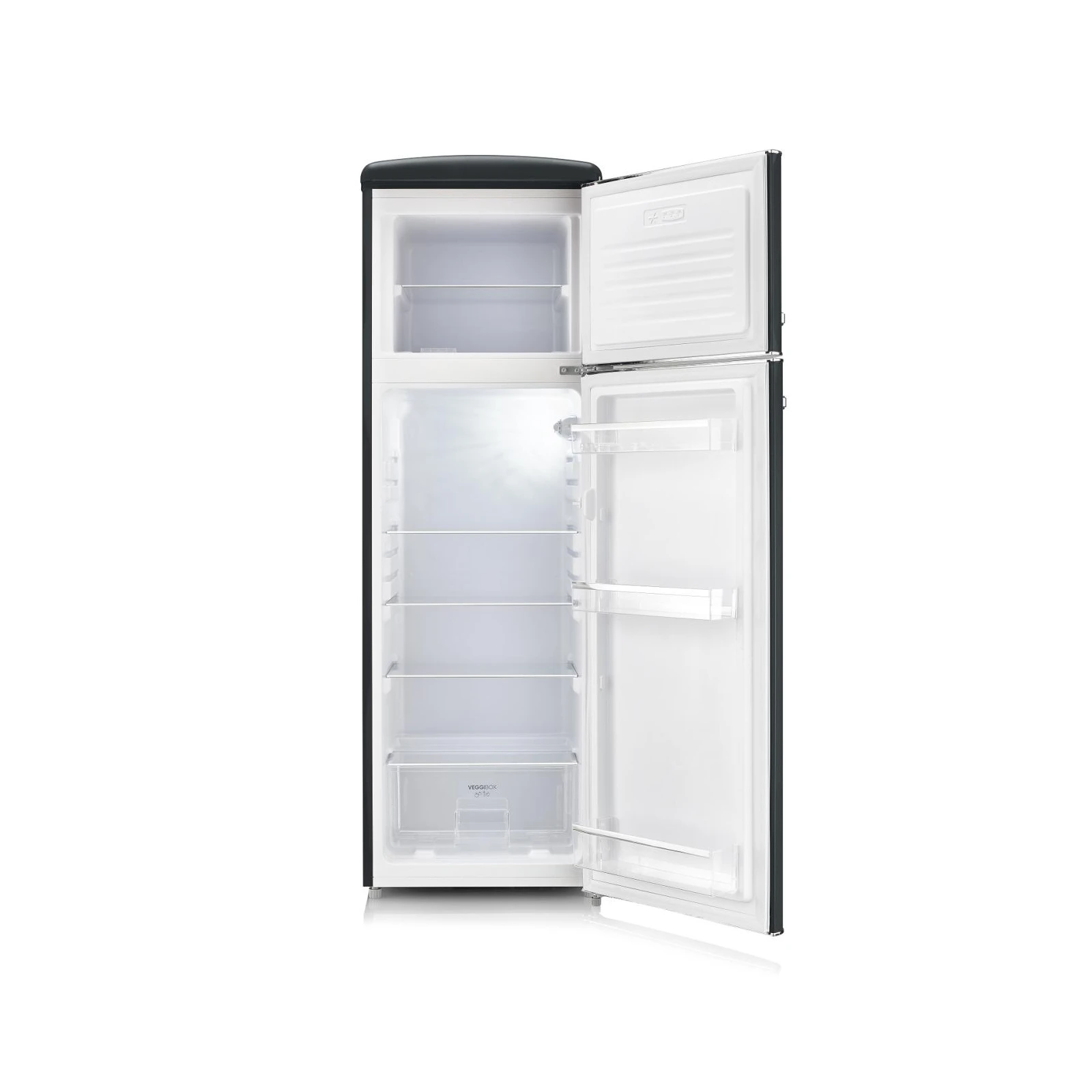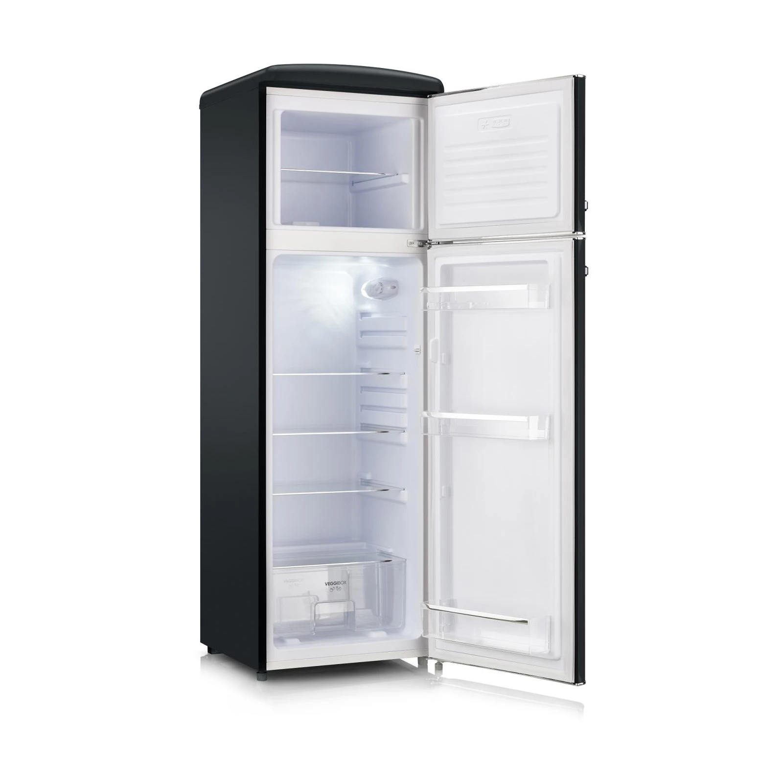 Stilren elegans i mellanstorlek. Denna svarta retro-kyl/frys på 166,5 cm kombinerar en lyxig högblank finish med praktisk förvaring och modern teknik för det medvetna hemmet.