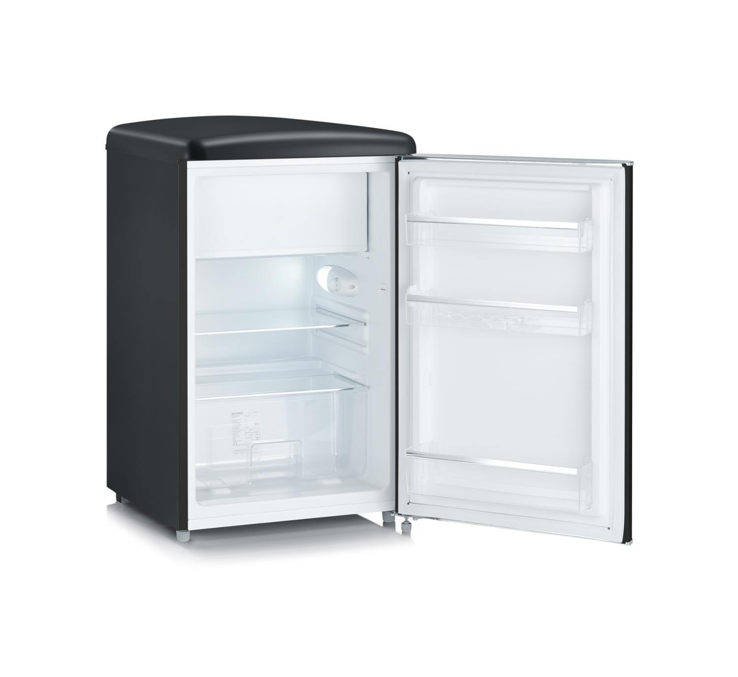 Sätt en sofistikerad och retroinspirerad prägel på ditt hem med Severin RKS 8832. Detta mattsvarta retrokylskåp i 50-talsstil kombinerar en tidlös look med modern energieffektivitet i klass D.