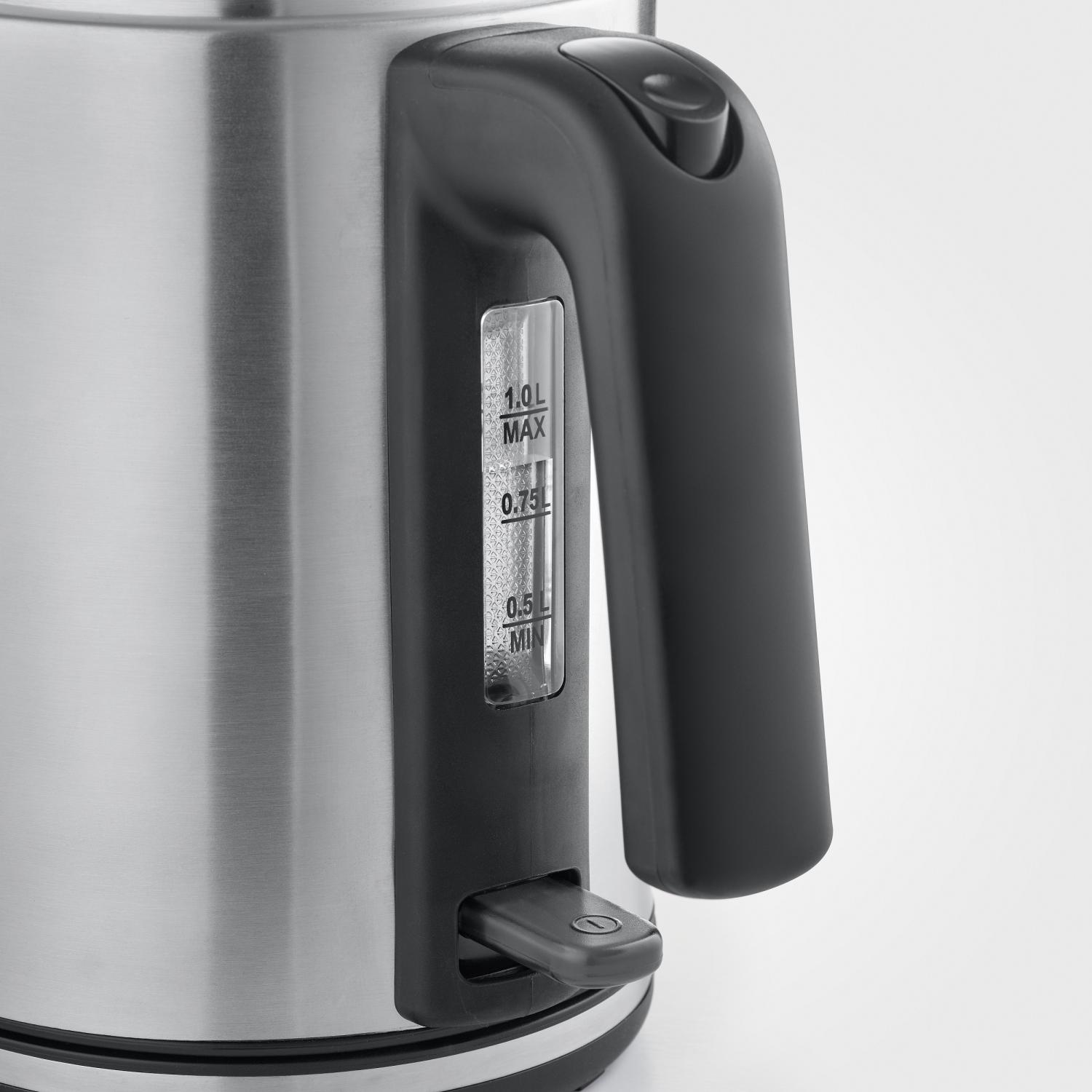 Kompakt och kraftfull vattenkokare på 2200W i borstat rostfritt stål – en pålitlig 1,0 liters modell med extra stor öppning för enkel rengöring och smidig hantering.